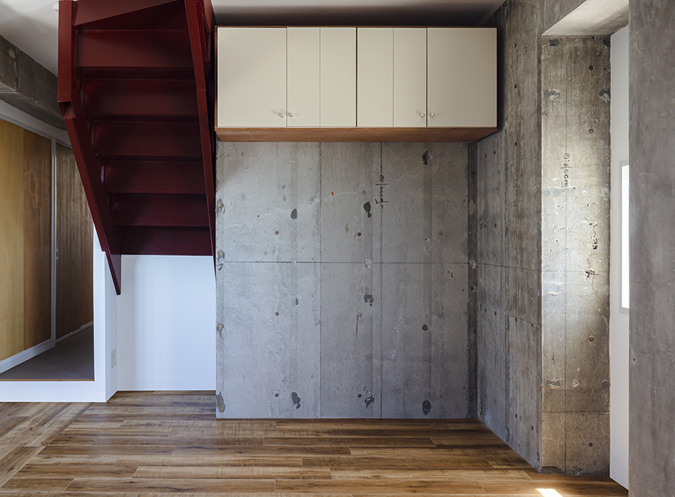 窓周りと撤去部の境界面に新たに窓枠のような見切りを設けることで、不均質な躯体の表情と雁行した空間に付加した壁面として現れる。また家具や建具など様々な箇所に経年劣化が見られていたが、家具を分解して部分的に吊り戸として利用したり、建具を表裏反転して合板仕上げとなる扉とした。床仕上げや設備機器など新設箇所を最小限に留めながらも、撤去や部分利用など既存ストックの価値転換を行うことで、室の更新を図った。
